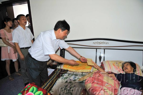 7月1日,在紀(jì)念建黨90周年之際,宜昌市新豐機(jī)電公司黨支部書記、董事長張本新同志,帶領(lǐng)公司15名黨員看望和慰問了陸城中筆社區(qū)五組77歲癱瘓在床的老黨員朱裕英同志。將全體黨員捐獻(xiàn)的慰問金2000元送到朱裕英同志手中。